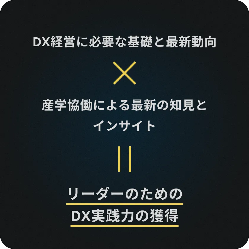 本講座は、将来の企業幹部である中堅マネジメント人材を対象とし、今後急速な進化が考えられるDX分野において適切な導入や判断、 マネジメントが行える、実践知のスキルを提供します。